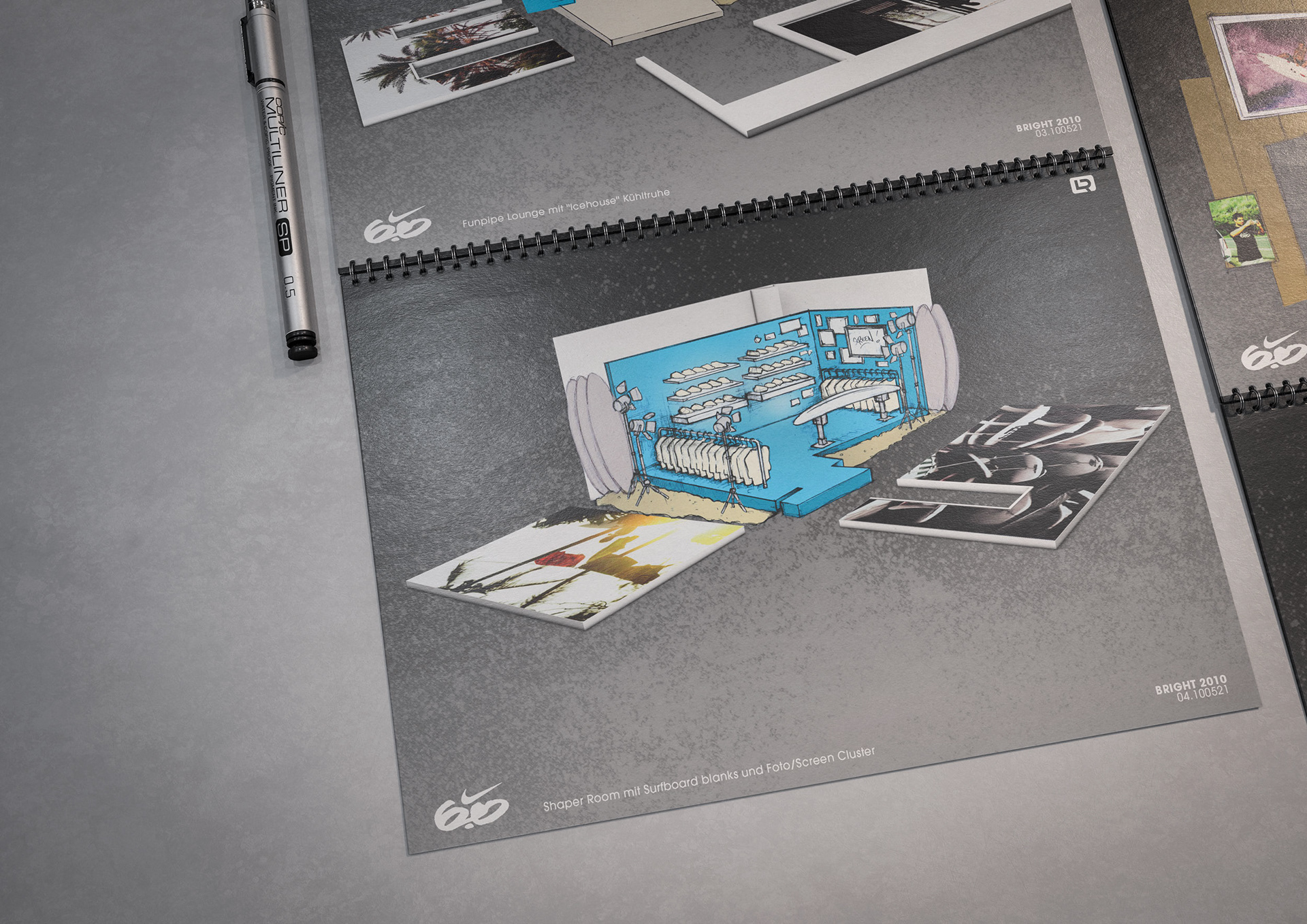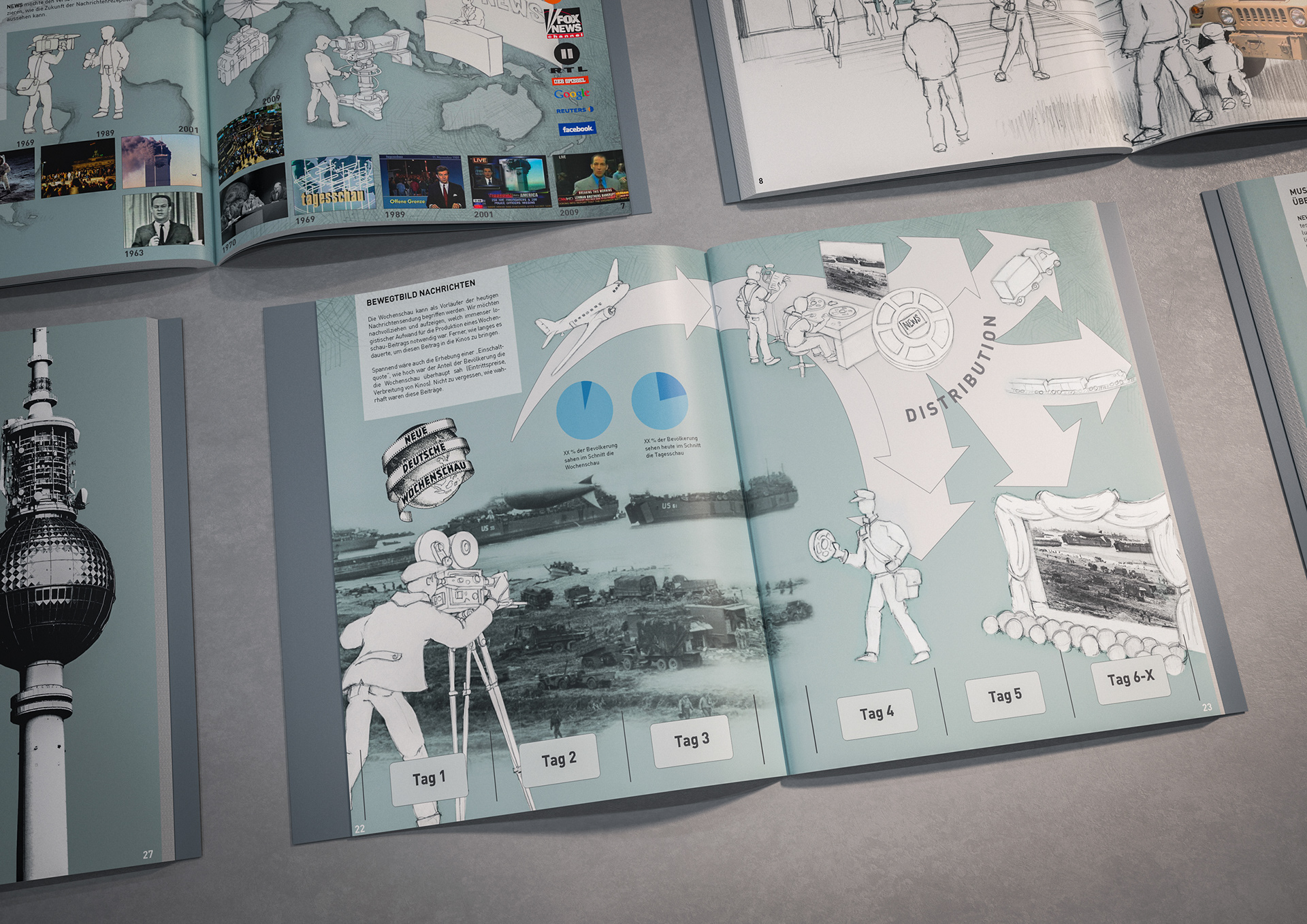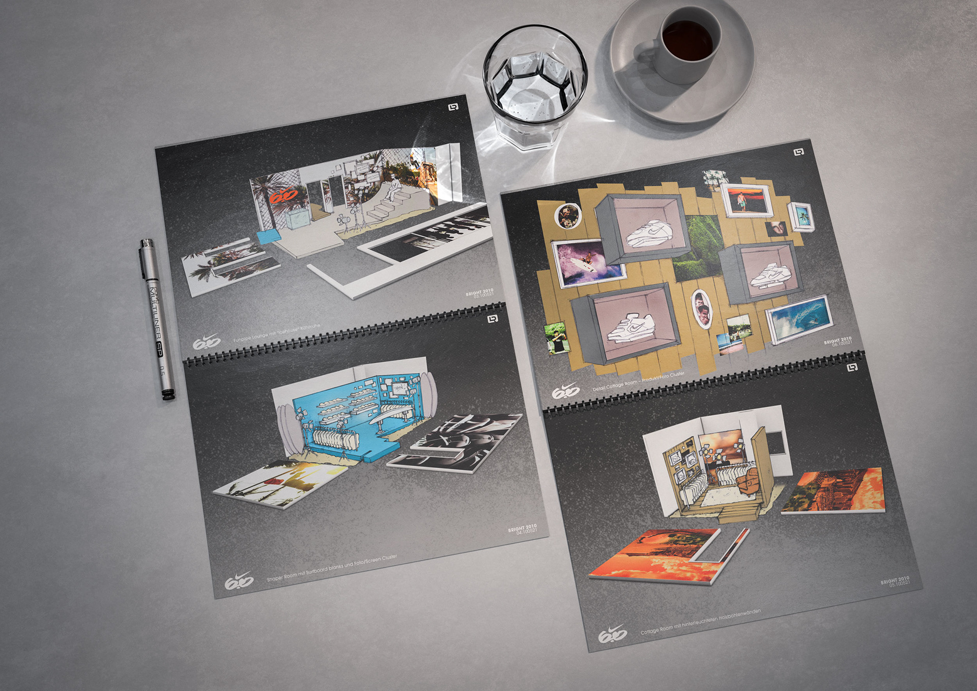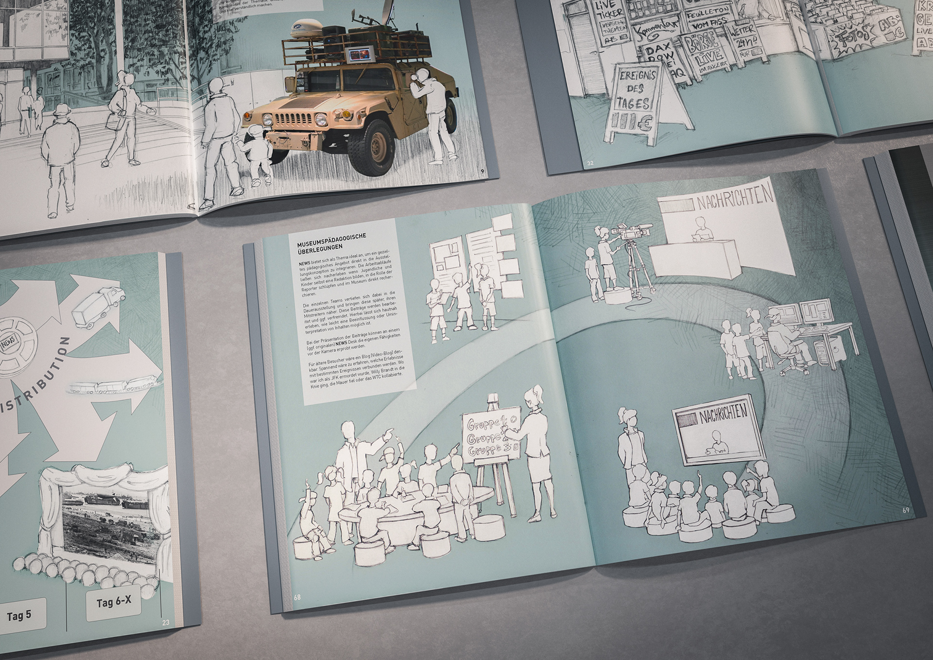 One of the techniques that enabled the rapid creation of these documents was my drawings and concept sketches—often combined with 3D-rendered elements and collaged content from existing visual material.