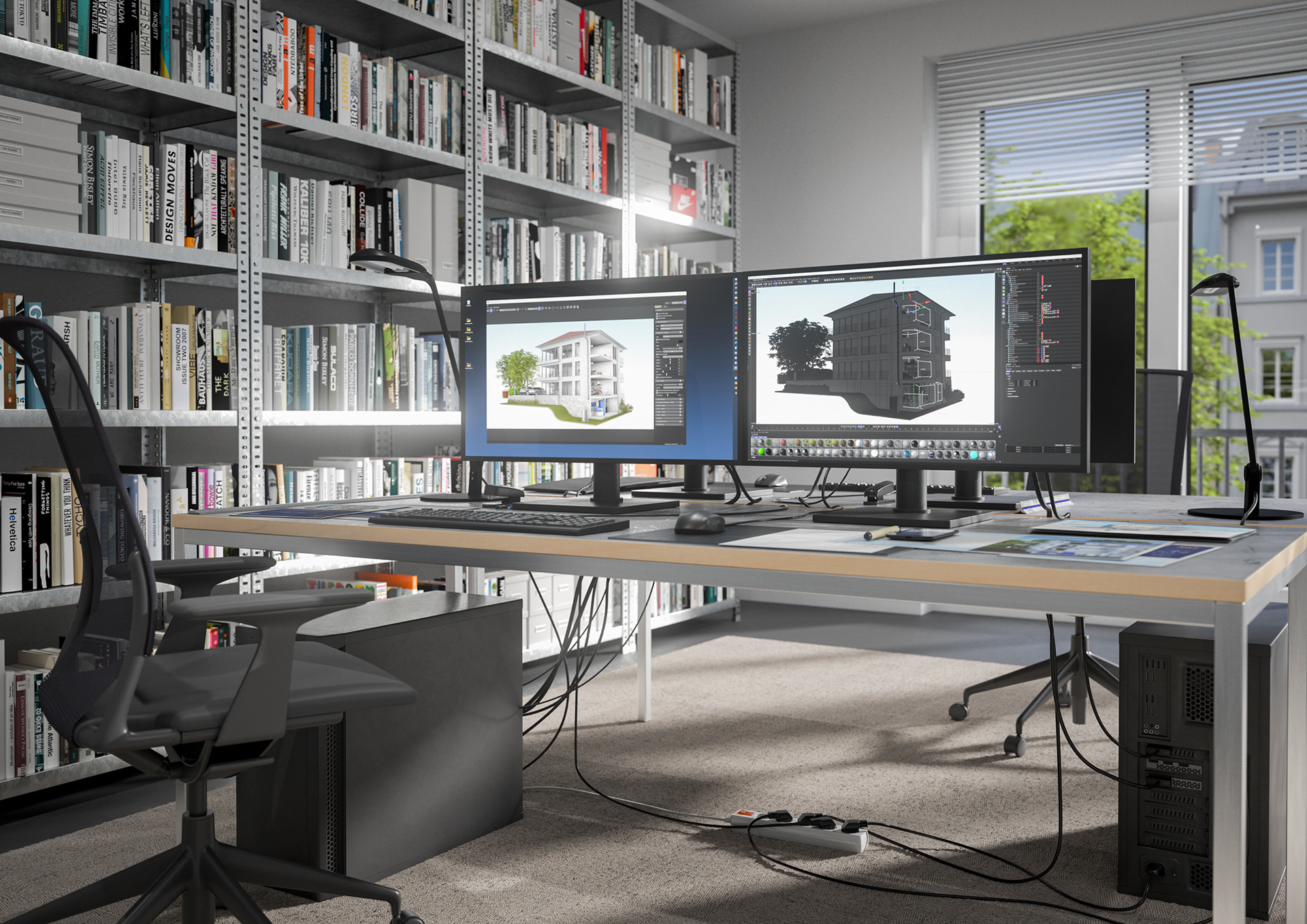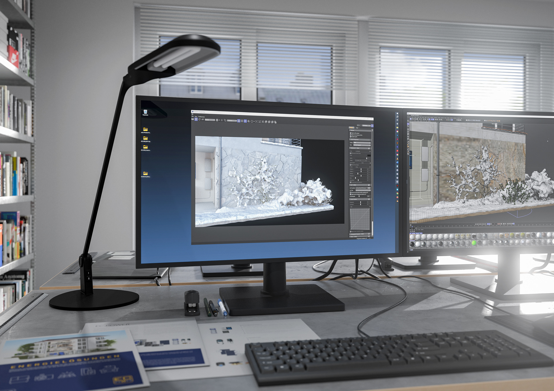 Furthermore, as the visual world for the client has evolved, it has become significantly more detailed. In addition to depicting the building’s surroundings with trees, lawns, and other elements, the latest version I created also shows the building across all four seasons.