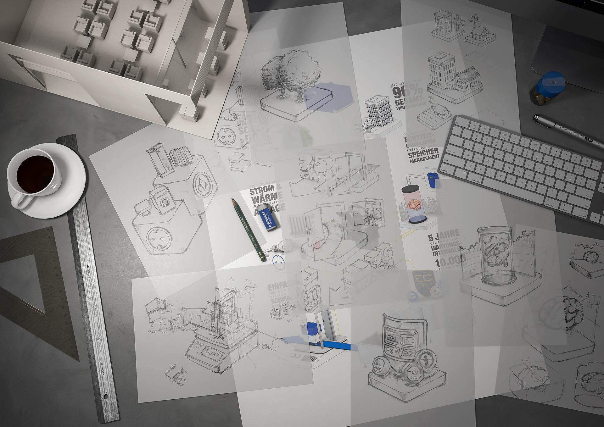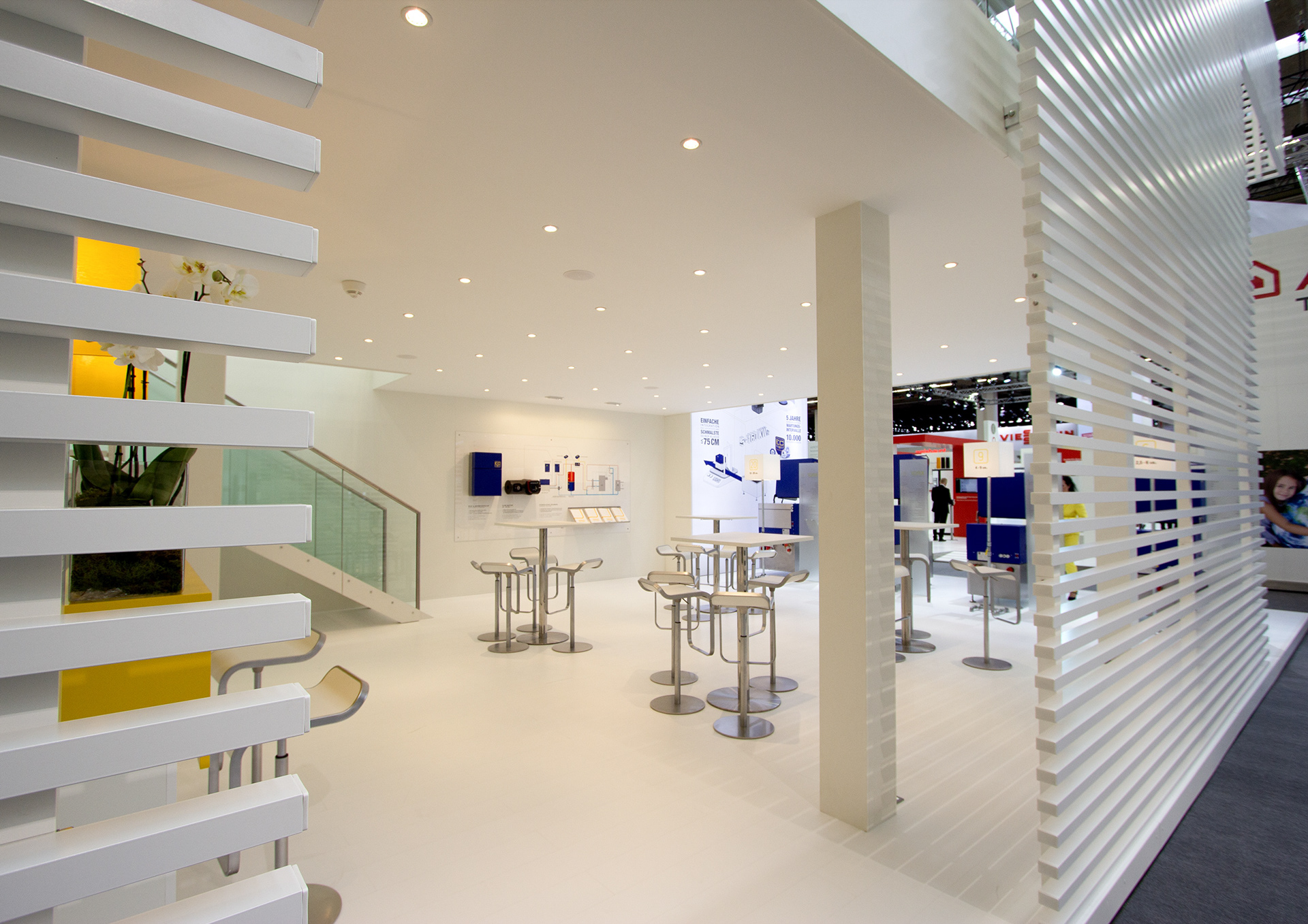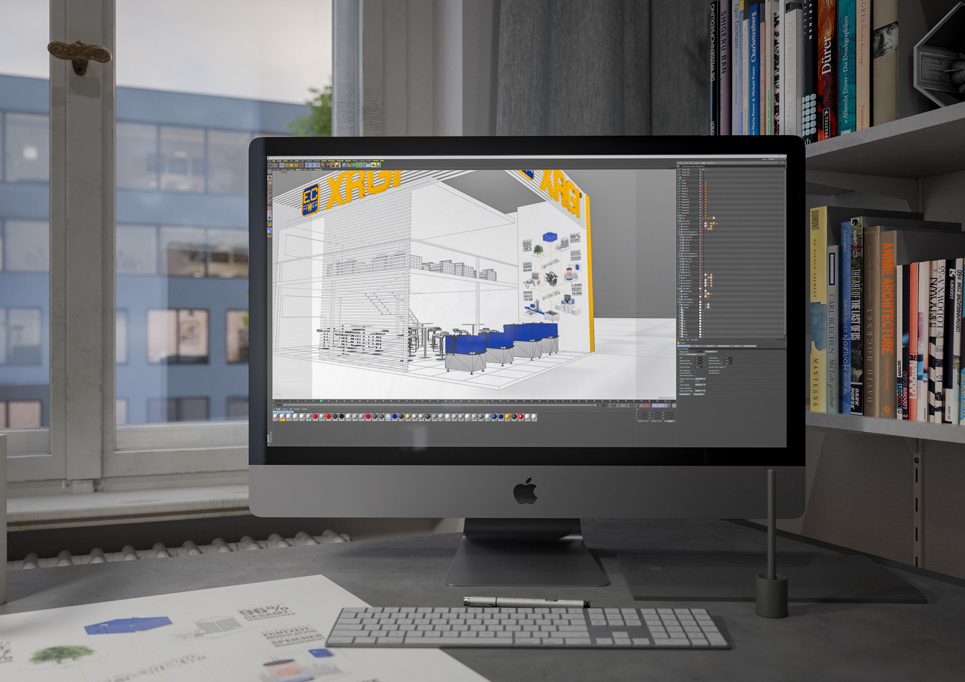 During the design process, four main variants for the stand emerged. The version ultimately chosen introduced a design element that would become a key visual feature of EC POWER’s trade fair appearances for the next ten years: the white, horizontally aligned slats with logos affixed to them.