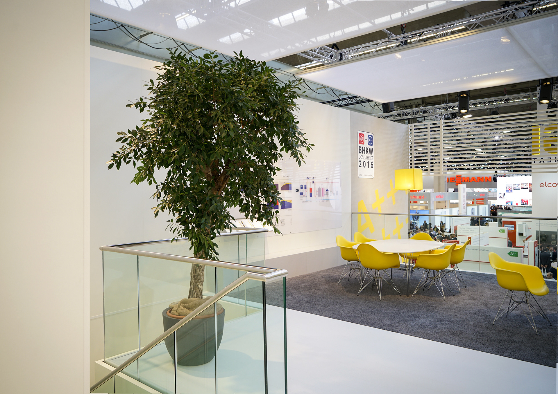 Above, in the enclosed upper section of the stand, a lounge—served by its own bar and storage—created a relaxed atmosphere conducive to high-level business discussions, set apart from the fair's bustling environment.