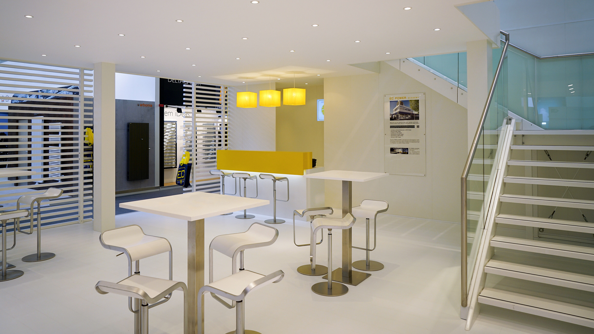 The EC POWER booth at ISH 2017 closely followed the successful stand concept from ISH 2015. The design aimed to reflect the brand's objective, technical, and straightforward character through a two-story spatial concept with a prominent, frontal product presentation.