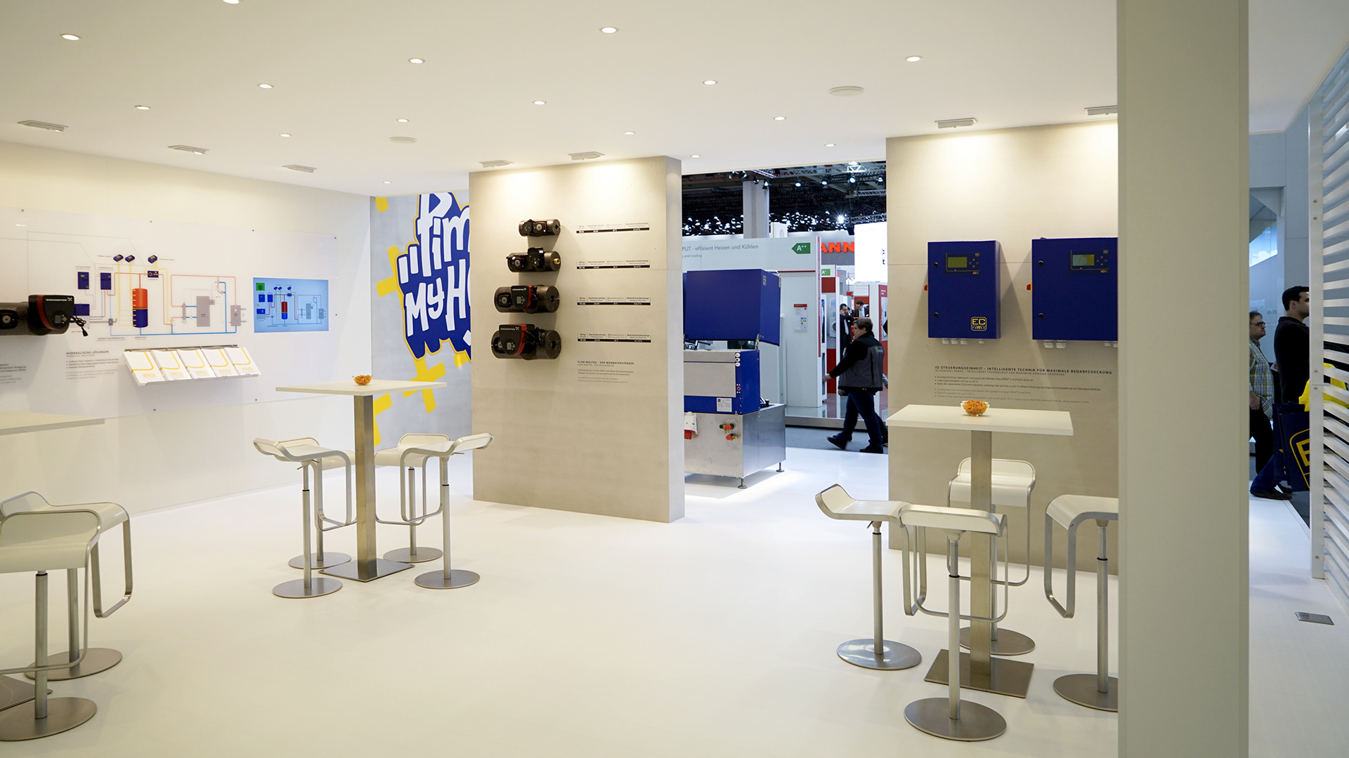 Behind the main product presentation area was a ground-level open networking space, equipped with additional exhibits and extensive schematic displays of exemplary hydraulic connections. A counter with direct storage access provided refreshments and snacks to attendees at the standing table groups.