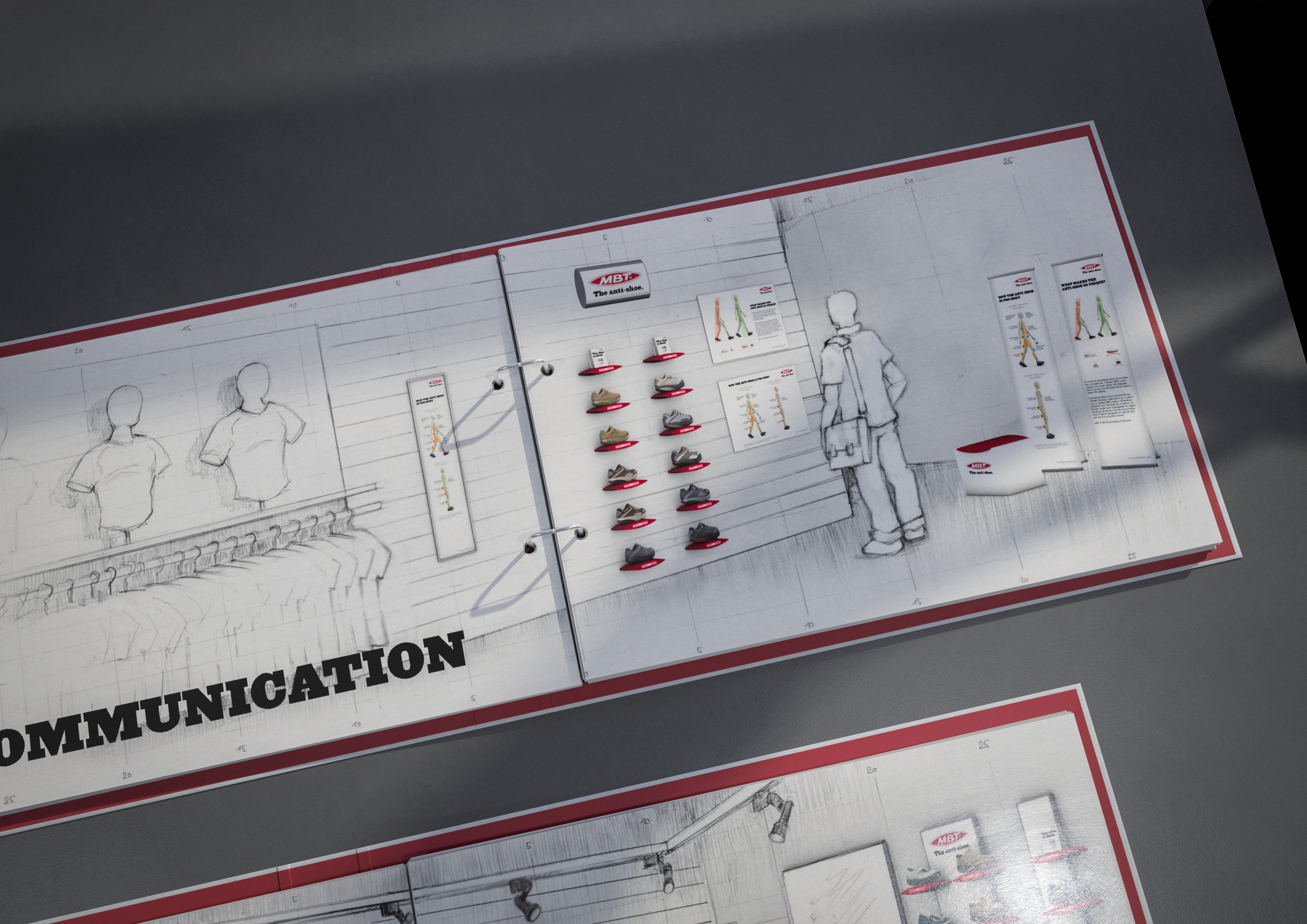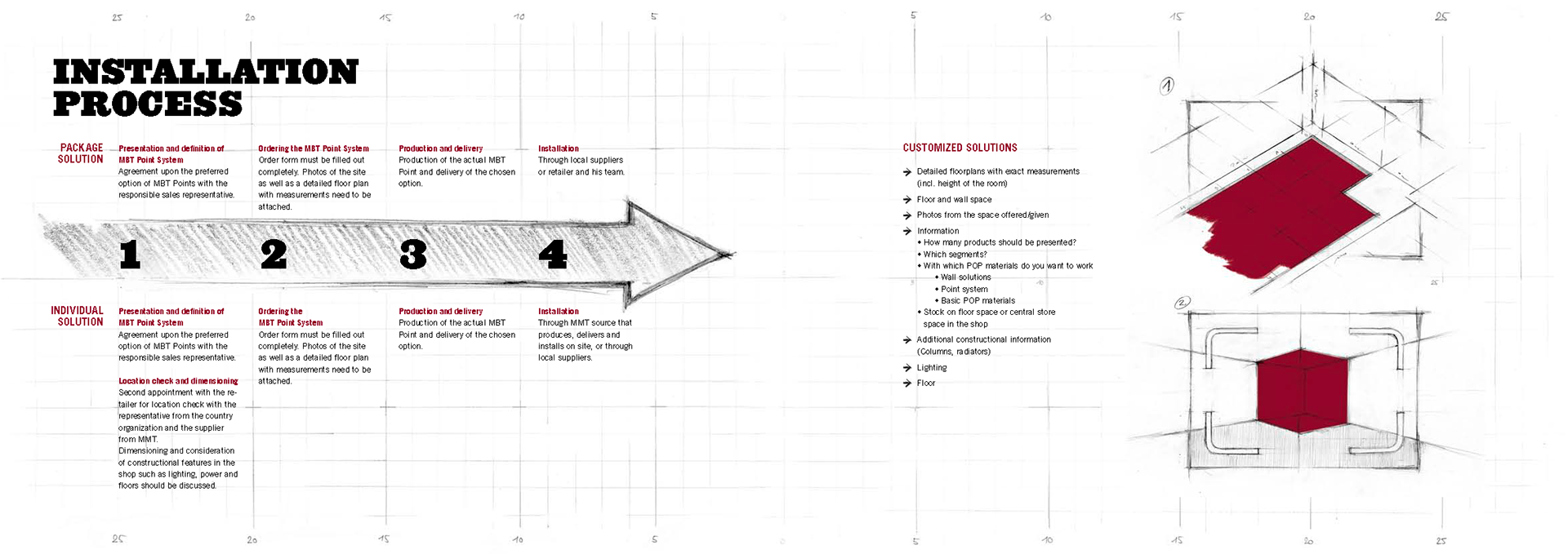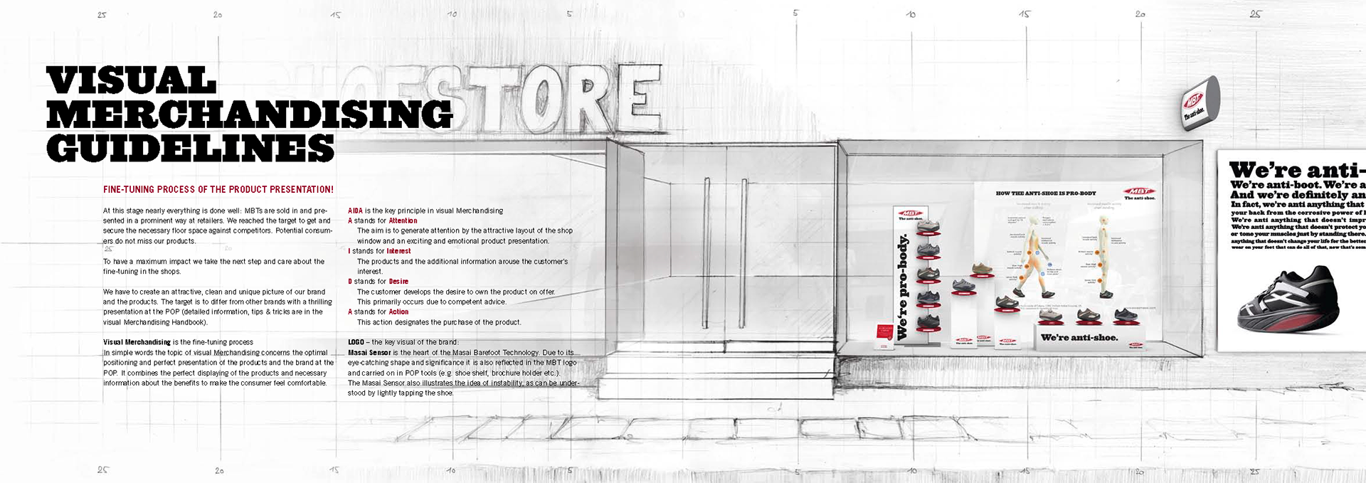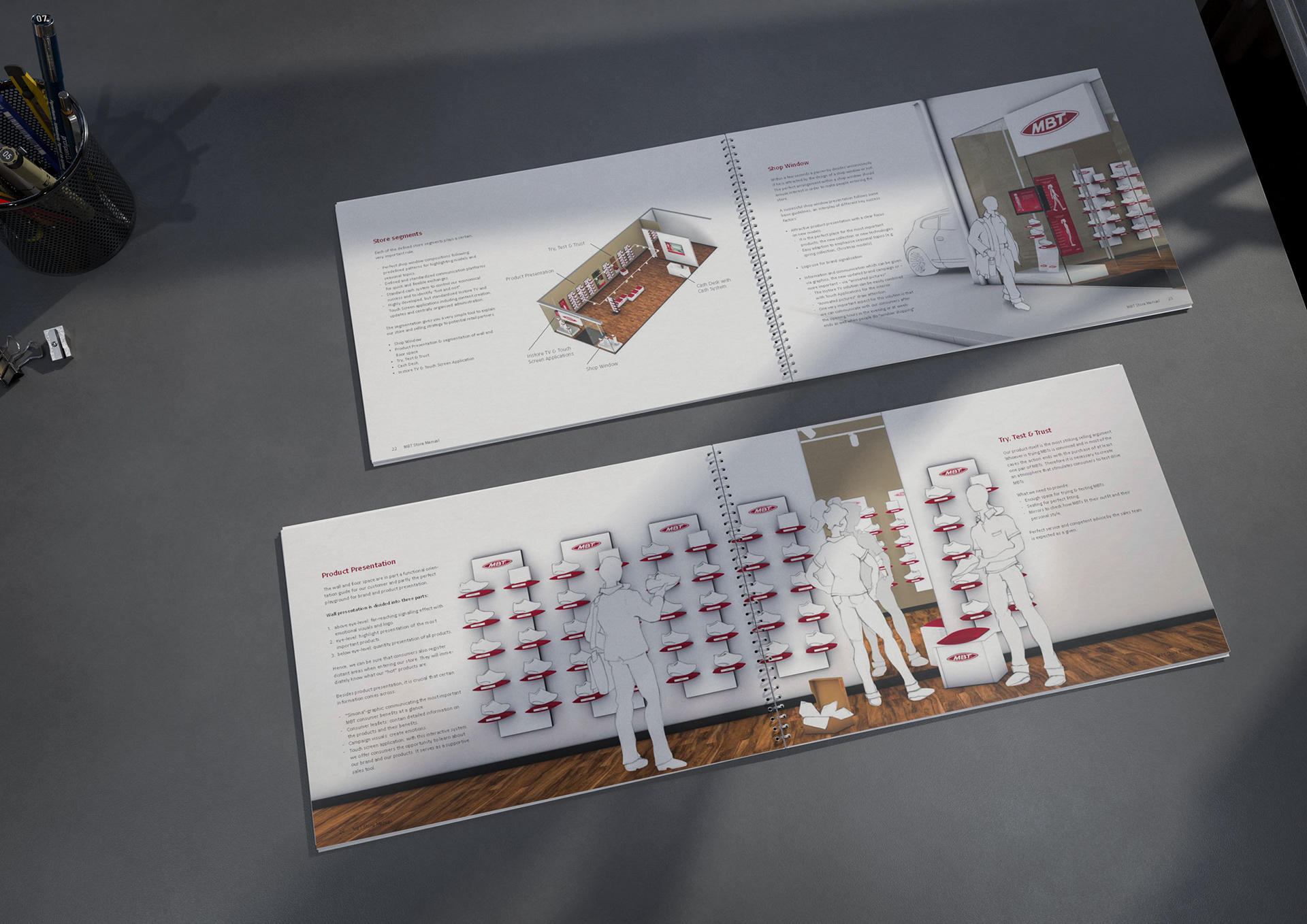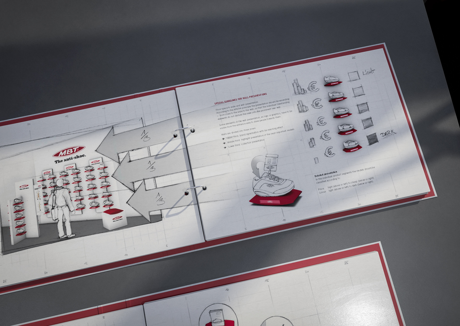 Through close collaboration with MBT, various guidebooks on topics such as retail marketing, visual merchandising, and shop design were developed and regularly updated. These detailed manuals covered aspects such as opening an MBT shop – from assessing potential locations and determining the required retail space to planning timelines for collaboration with the parent company and finally launching the store. Additionally, they outlined fundamental principles for product arrangement within the shop, guidelines for window display presentations, and other key retail aspects.