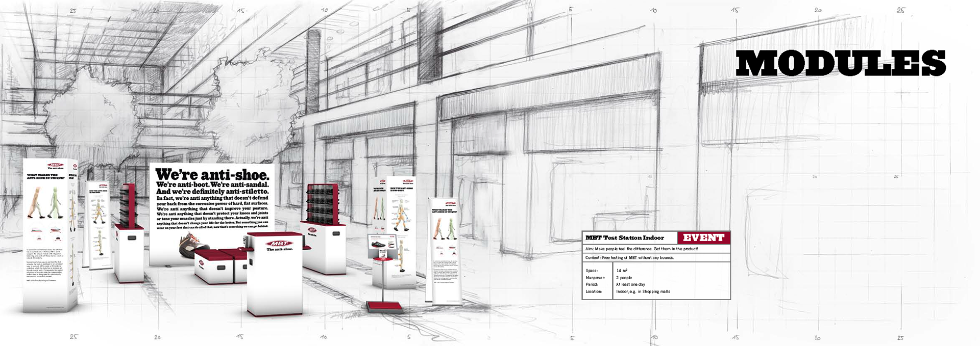 The orthopedic shoes of the MBT – Masai Barefoot Technology – brand experienced significant expansion in many European countries, particularly from 2006 onwards. Laborrotwang had the privilege of counting MBT among its key clients during these years and was responsible for the brand’s trade fair and shop design.