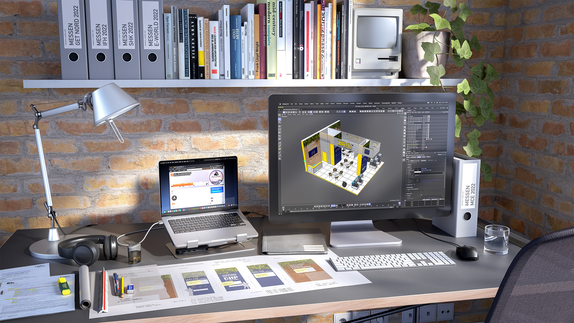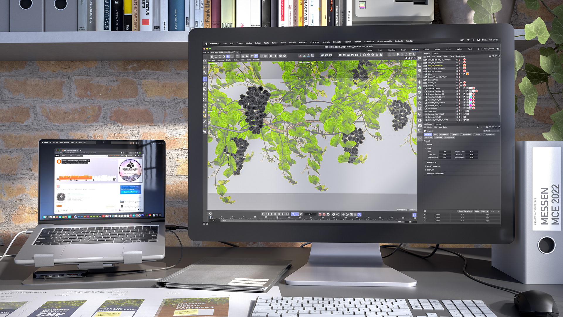 In addition to my usual responsibilities for trade show booths – general design, visualisation, and coordination with the booth constructor, trade fair management, and the client – I was also tasked with creating the backgrounds for the large-scale graphics, including the grapevines.