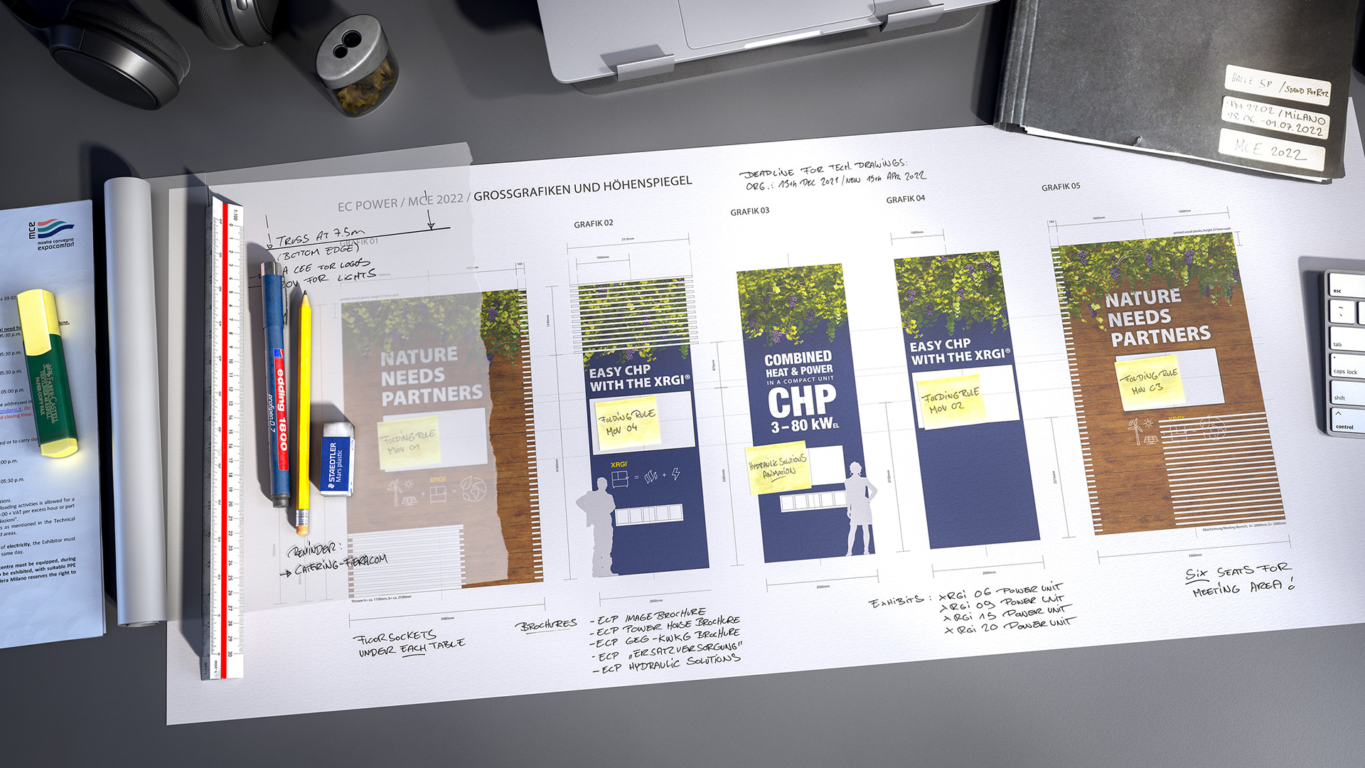 Instead of the over 5-meter-high video walls, the 2022 booth featured four large screens, each approximately 2 meters wide. The videos shown on the monitors were created by Artist Design as part of the "Easy CHP" campaign. The concept and hand-drawn animations were developed by Creative Director Aksel Wagner, while video editing was carried out by Jörg Fröhling. I myself took on the role of the "actor": it is my hands folding and arranging the folding rulers into various shapes in the films.