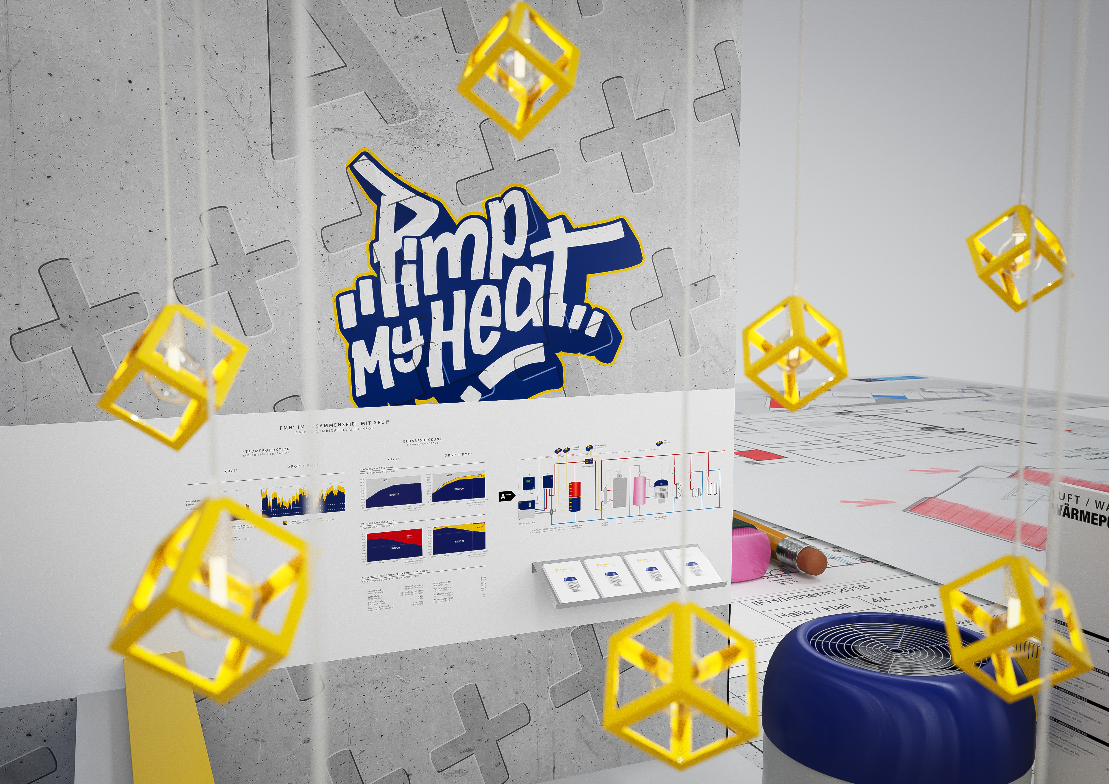 Additionally, the so-called "lamp swarm" made its debut – a formation of 40 "cube" lamps suspended at varying heights in the client’s signature yellow. From the previous year, we retained the graffiti graphic "Pimp my Heat," which I designed, as well as the large-scale printed concrete-look surfaces.
