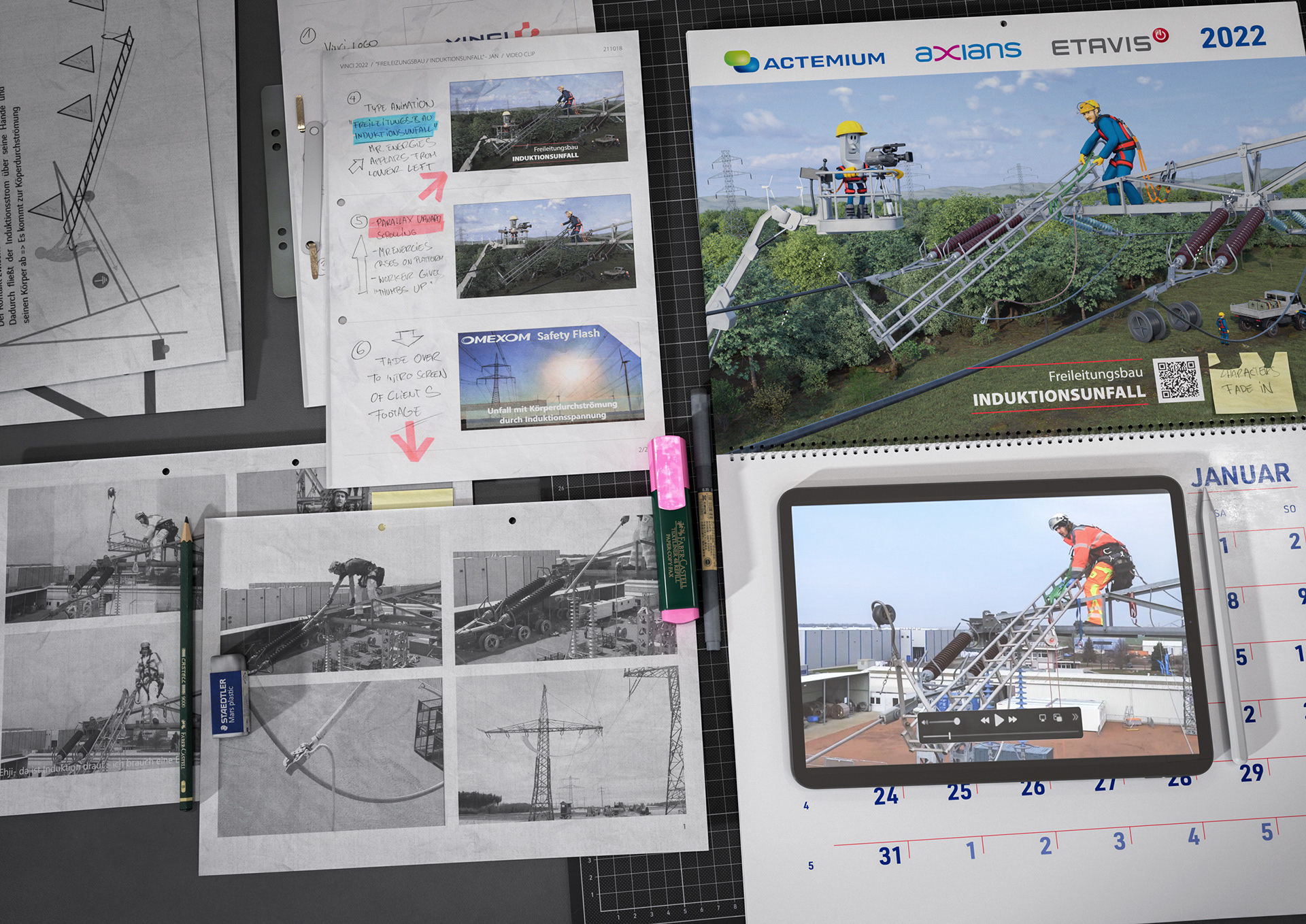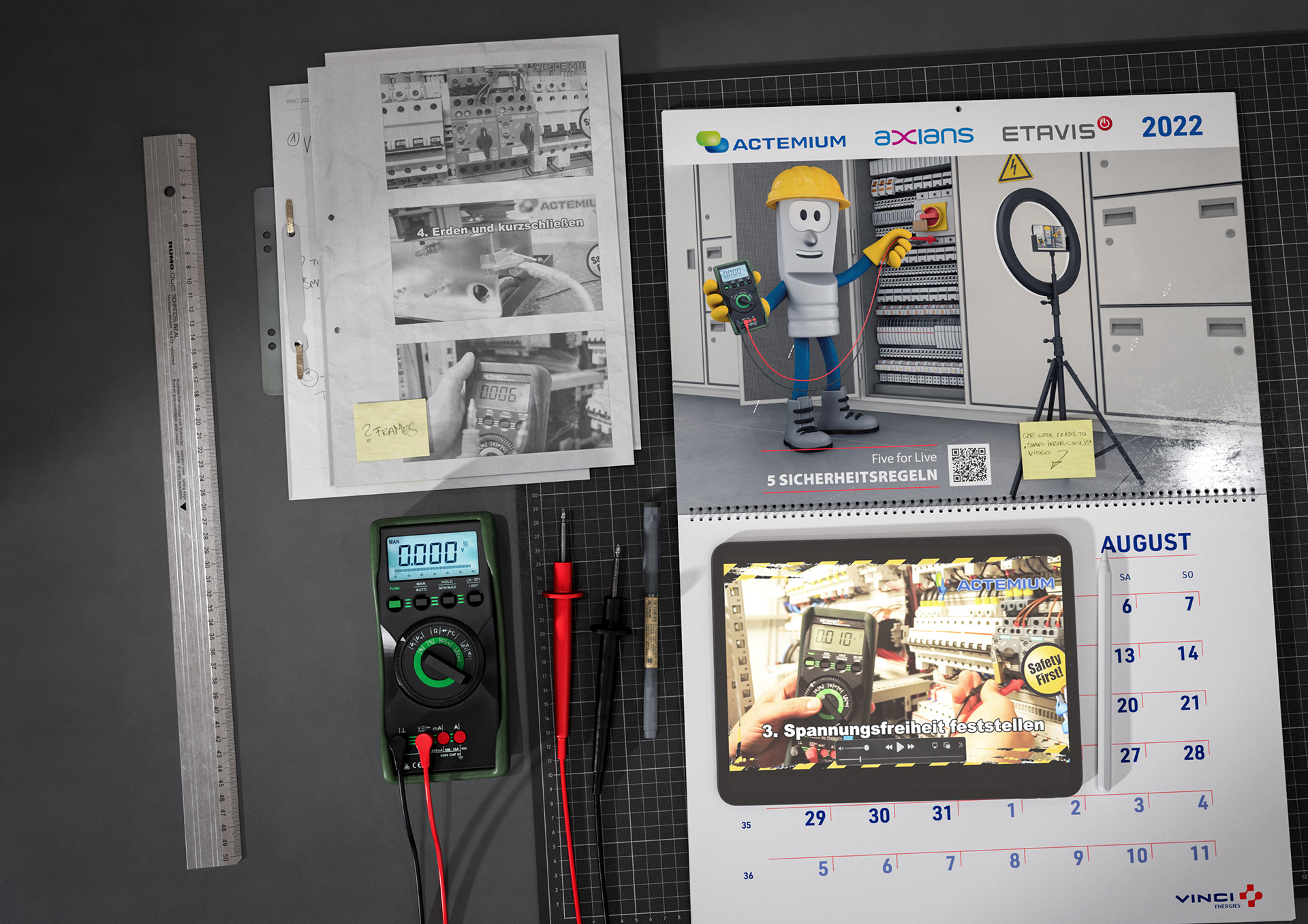 The work safety calendar of the Vinci Group, featuring companies such as Actemium, Cegelec, Omexom, and many others, has been designed by Artist Design for ten years. From 2017 onwards, the agency also took over creating the illustrations, which became part of my responsibilities.