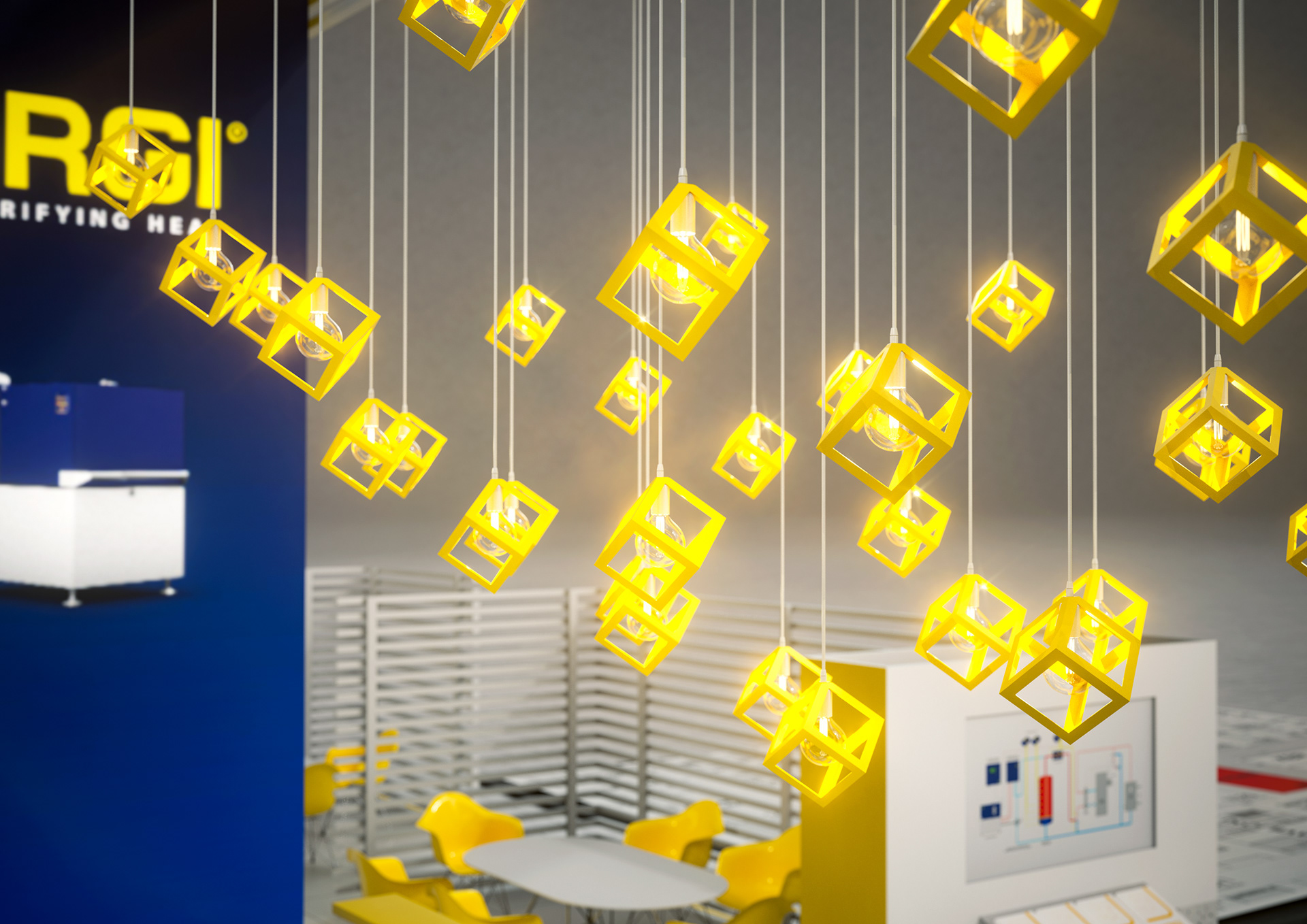 Covering an area of approximately 150 square metres (50 feet x 30 feet), the stand was one of the larger projects I had worked on. Its standout design feature was the central, portal-like structure. The key elements we defined for the 2018 exhibition stands included two nearly 6-metre-tall LED video walls, each about 2 metres wide, as well as a "lamp cluster" that served as a visual highlight.